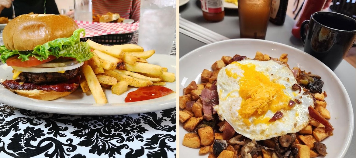 Some must-try dishes include Fried Pickles, Chicken Tenders, and the Peach Cobbler. For breakfast, the French Toast satisfies any sweet craving.